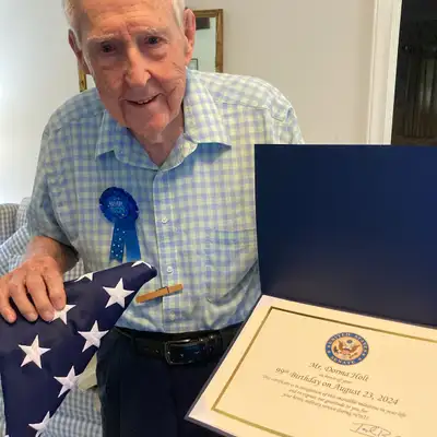 Liz: [00:00:00] Hi, I am Liz Morris. I'm here with Bill Lume, and we're so excited for our special guest today. Um, it's Mr. Dorma Holt. He lives in Burlington, North Carolina. He's a 99-year-old World War II [00:00:15] veteran.